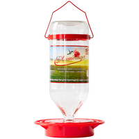 Our 32oz easy-fill glass container is guaranteed not to drip and is designed to feed ONLY hummingbirds. It is made of red ABS Plastic base (non-metallic) and a full ring perch with 8 feeding stations with metal hangers.