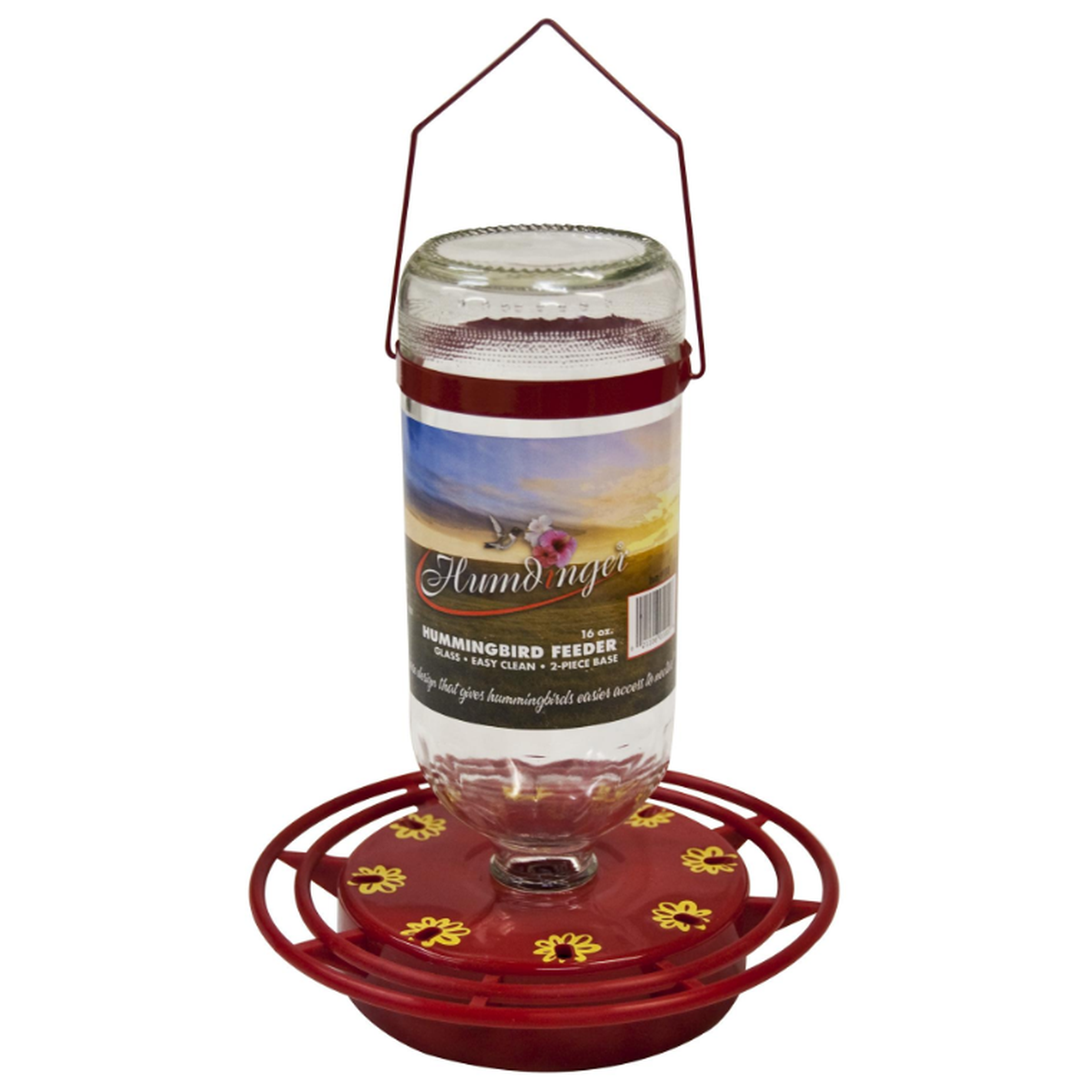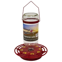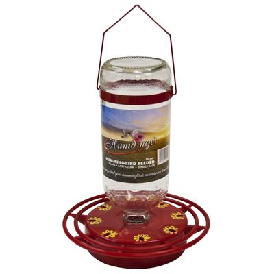 Our 16oz easy-fill glass container is guaranteed not to drip and is designed to feed ONLY hummingbirds. It is made of red ABS Plastic base (non-metallic) and a full ring perch with 8 feeding stations with metal hangers.
