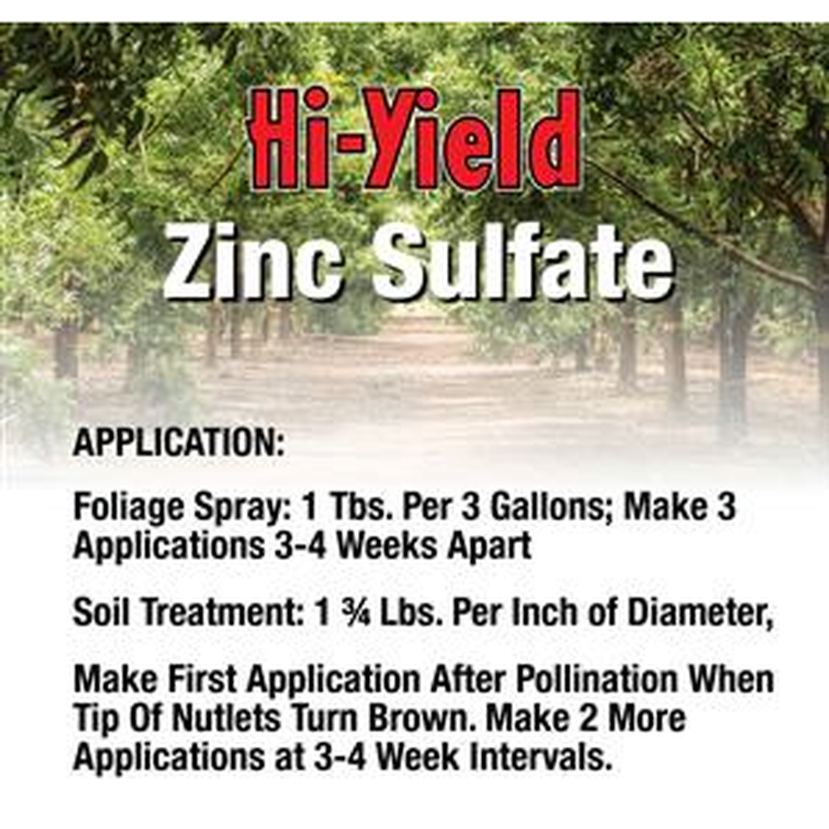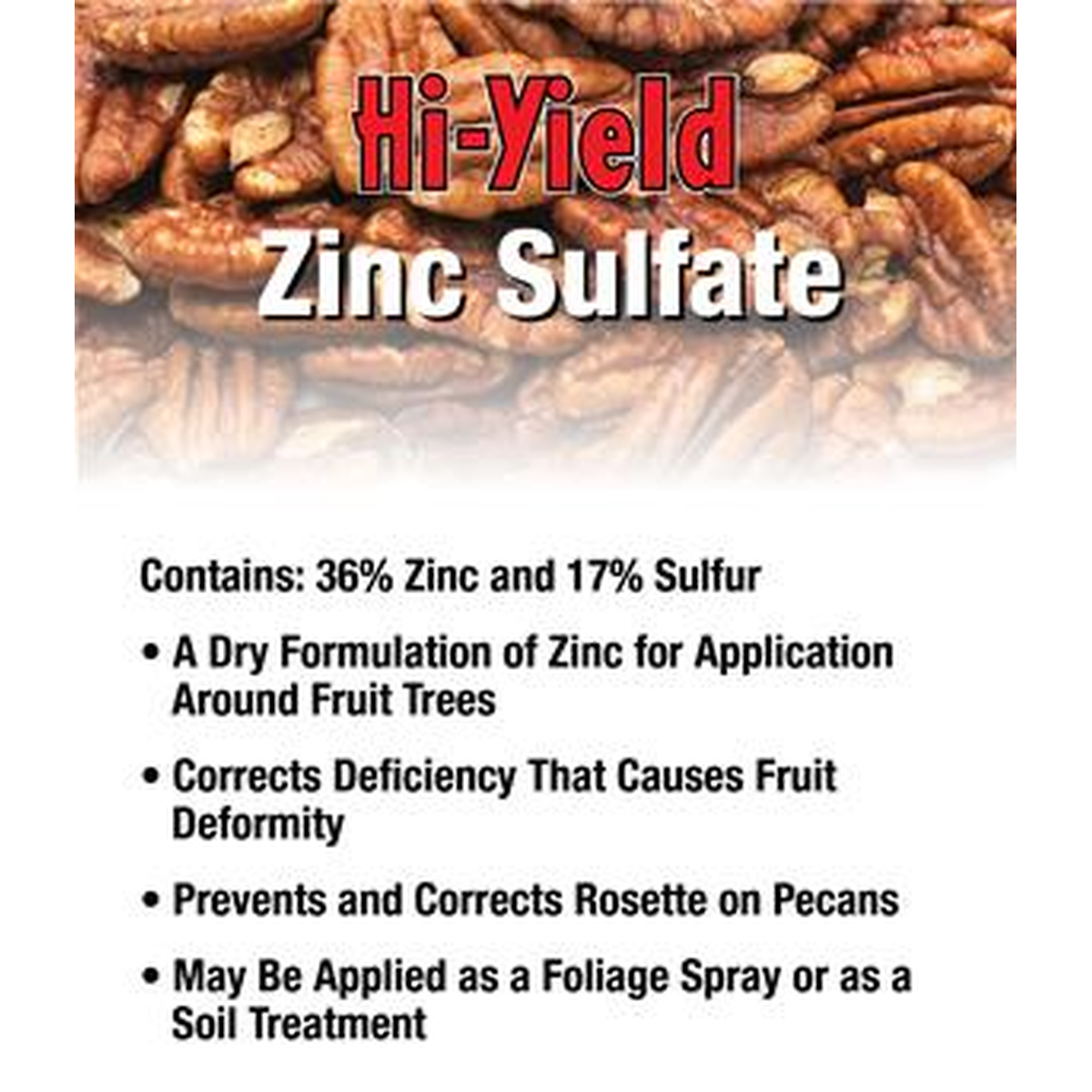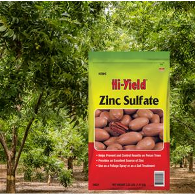 A dry formulation of zinc for application around fruit trees. Corrects deficiency that causes deformity of fruit, prevents and corrects Rosette on Pecans.