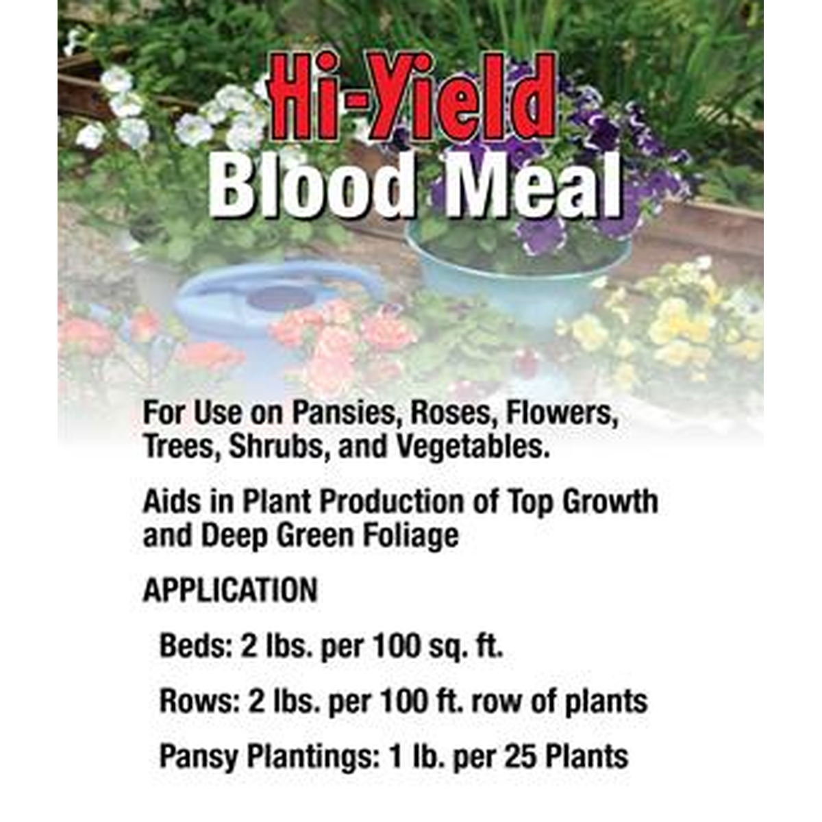 Application Rates: Beds: 2 lbs. per 100 sq. ft. Rows: 2 lbs. per 100 ft. row. Pansy plantings: 1 lb. per 25 plants.