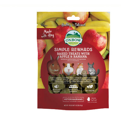 Sweet and wholesome, blended to perfection! Simple Rewards Baked Treats with Apple & Banana combine the irresistible flavors of real apple and banana with wholesome, high fiber Timothy hay to create a delicious treat rabbits, guinea pigs, chinchillas and other small pets love. Feed Oxbow treats to add variety and enrichment to your pet's diet.