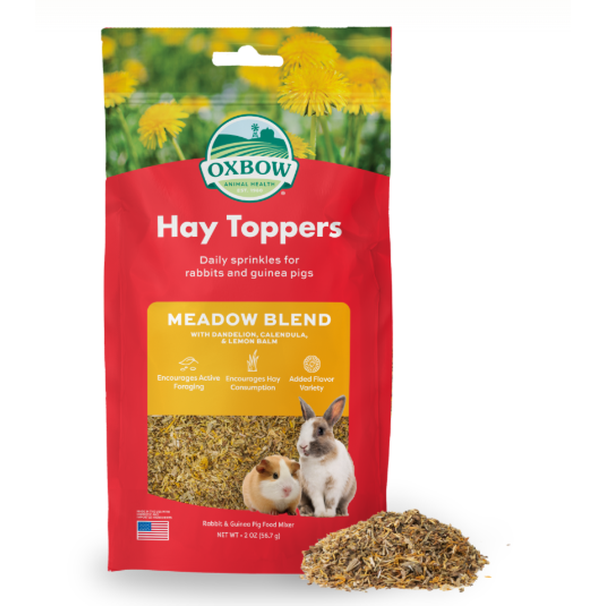 Transform your pet's hay into a flavorful and enriching experience with Oxbow Hay Toppers Meadow Blend - a perfect addition to rabbit food, guinea pig food, bunny food, and chinchilla food. Specially crafted for small herbivores like guinea pigs, rabbits, and chinchillas, this premium blend features wholesome dandelion, vibrant calendula, and soothing lemon balm to offer an exciting variety of tastes and textures your pet will love.