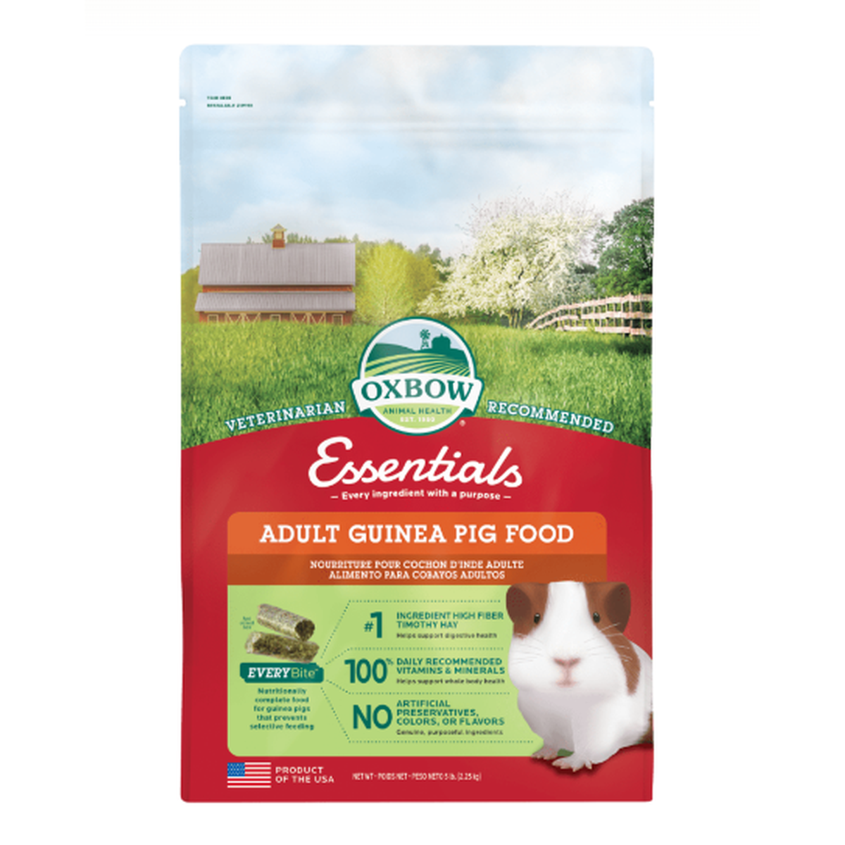 Essentials Adult Guinea Pig is made with premium, purposeful ingredients to support your pet's healthy, active lifestyle. We start with high fiber Oxbow Western Timothy hay for healthy digestion and add stabilized Vitamin C and prebiotics to help support whole body health. Essentials Adult Guinea Pig provides 100% of your pet's daily recommended vitamins and minerals with no artificial preservatives, colors or flavors.
