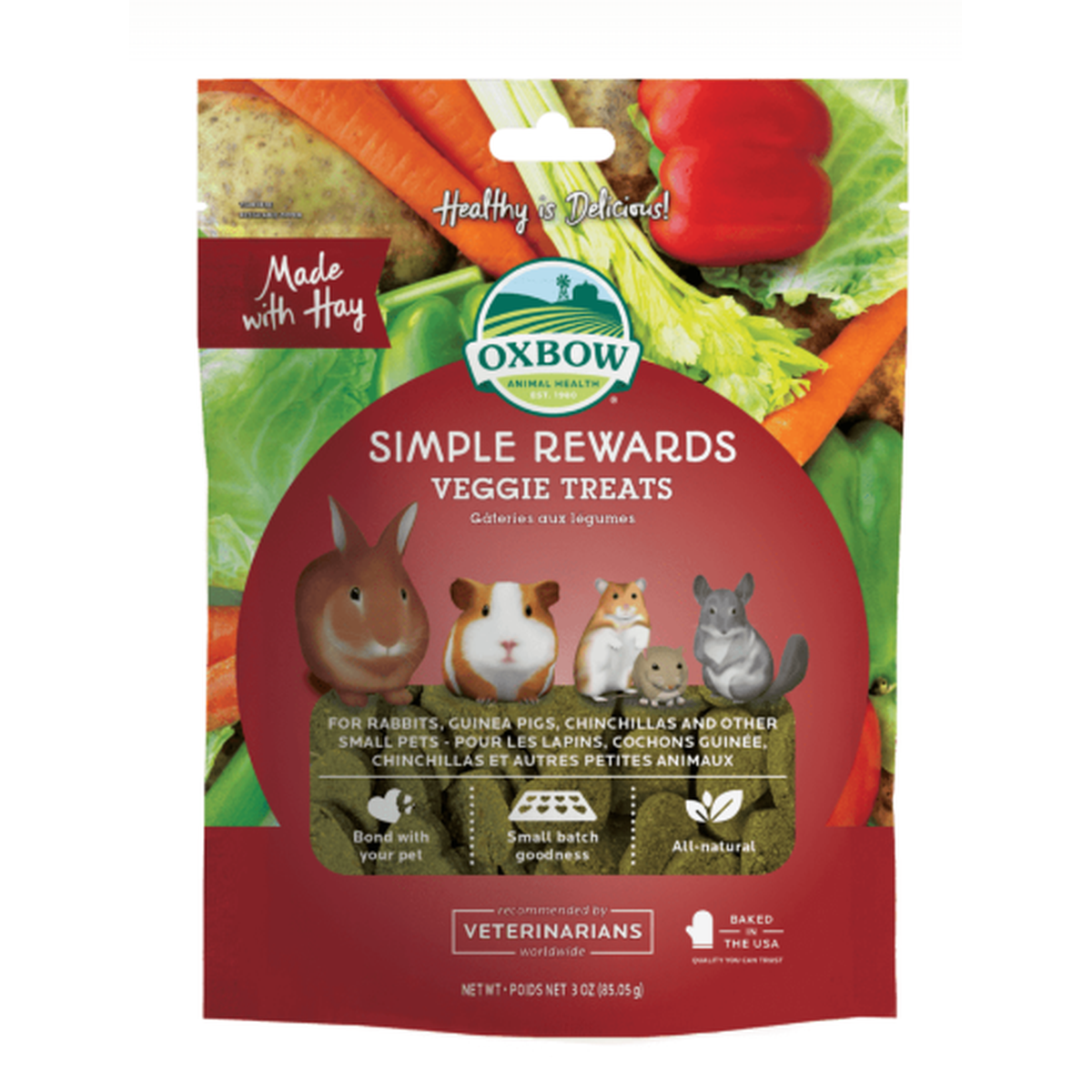 From the garden to your pet - veggie goodness from Oxbow Animal Health! The wholesome, oven baked blend of vegetables and greens in Oxbow Veggie Treats translates into a tasty, enriching reward for your pet. Our treats provide the nutritional balance animals would find in their natural habitats and help add healthy variety to your pet's diet. Simple Rewards allows you to give your animal a healthy, delicious treat you can both feel good about.