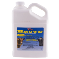 BRUTE Pour on for cattle is a ready to use formulation containing permethrin. This product is effective against biting and sucking lice, Gulf Coast ear ticks and controls susceptible horn flies for up to 6 weeks. Horn fly residual protection will vary depending on the level of resistance within a particular area. Aids in the control of a variety of other insect pests of cattle and horses.